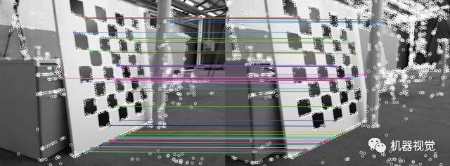 对实现代码感兴趣的同学请Google“opencv 匹配”即可,在openCV的教程上也有很明白的例子。上面的例子可以看出,我们找到了一些匹配,但其中有些是对的(基本平等的匹配线),有些是错的。这是由于图像中存在周期性出现的纹理(黑白块),所以容易搞错。但这并不是问题,在接下来的处理中我们会将这些影响消去。