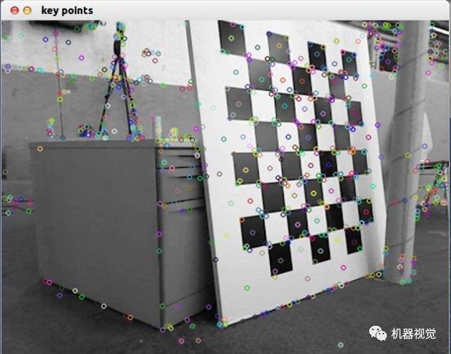 你肯定可以看出,小萝卜往右转过了一定的角度。但究竟转过多少度呢?这就要靠计算机来求解了。这个问题称为相机相对姿态估计,经典的算法是ICP(Iterative Closest Point,迭代最近点)。这个算法要求知道这两个图像间的一组匹配点,说的通俗点,就是左边图像哪些点和右边是一样的。你当然看见那块黑白相间的板子同时出现在两张图像中。在小萝卜看来,这里牵涉到两个简单的问题:特征点的提取和匹配。