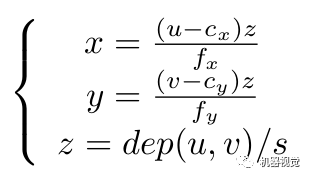 o’-uv是图片坐标系,o-xyz是Kinect的坐标系。假设图片中的点为(u,v),对应的三维点位置在(x,y,z),那么它们之间的转换关系是这样的: