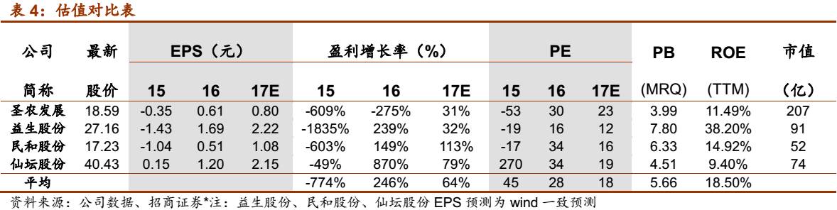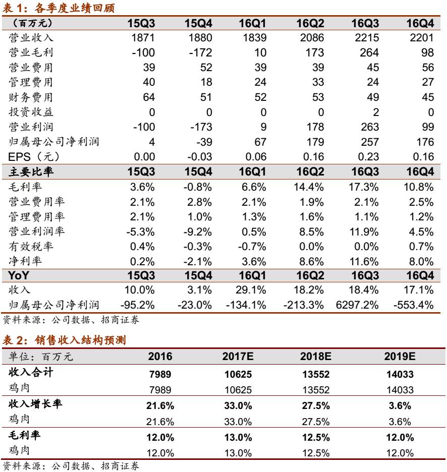 ,目前拥有产能16万吨,2017年下半年产能将进一步提升至22万吨。其产品主要销至日本等海外市场,肯德基等大型餐饮连锁企业,沃尔玛等商超,农贸批发市场以及食品加工厂。2016年圣农食品毛利率19.62%,比公司高7.5个百分点,实现净利润1.06亿元,同比增长82%。公司拟发行1.24亿股收购圣农食品100%股权,暂定发行价16.21元。通过本次交易,圣农实业将实现肉鸡生产与深加工板块的整体上市,将肉鸡产业链延伸至终端消费,符合公司拓展主营业务的长远发展战略。