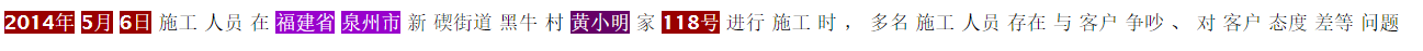 2014年/NT 5月/NT 6日/NT 施工/NN 人员/NN 在/P 福建省/NR 泉州市/NR 新/JJ 碶街道/NN 黑牛/NN 村/NN 黄小明/NR 家/NN 118号/NT 进行/VV 施工/NN 时/LC ,/PU 多名/AD 施工/NN 人员/NN 存在/VV 与/P 客户/NN 争吵/VV 、/PU 对/P 客户/NN 态度/NN 差等/NN 问题/NN