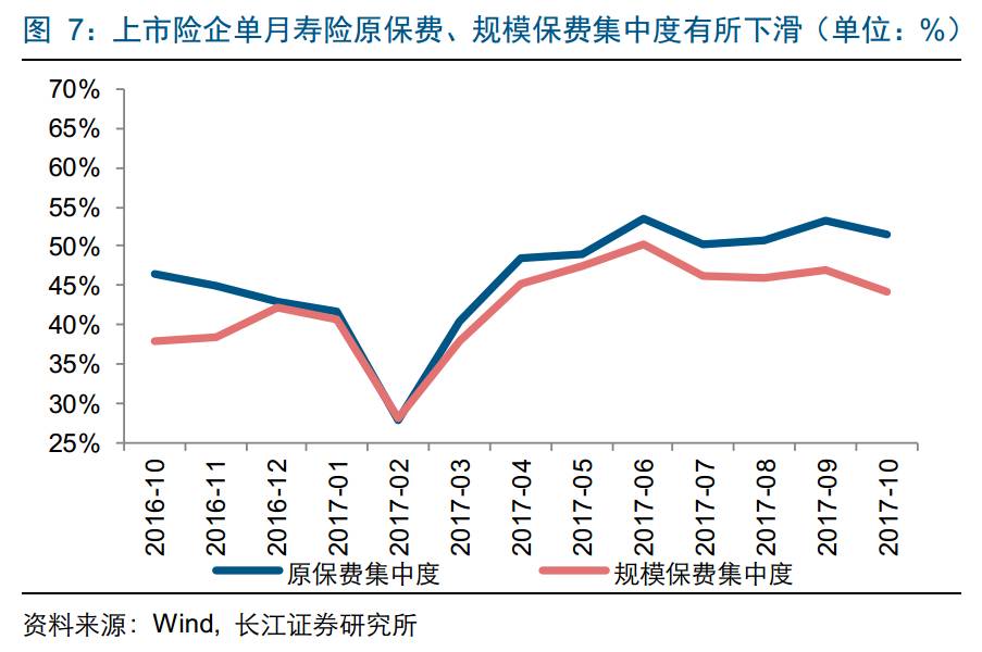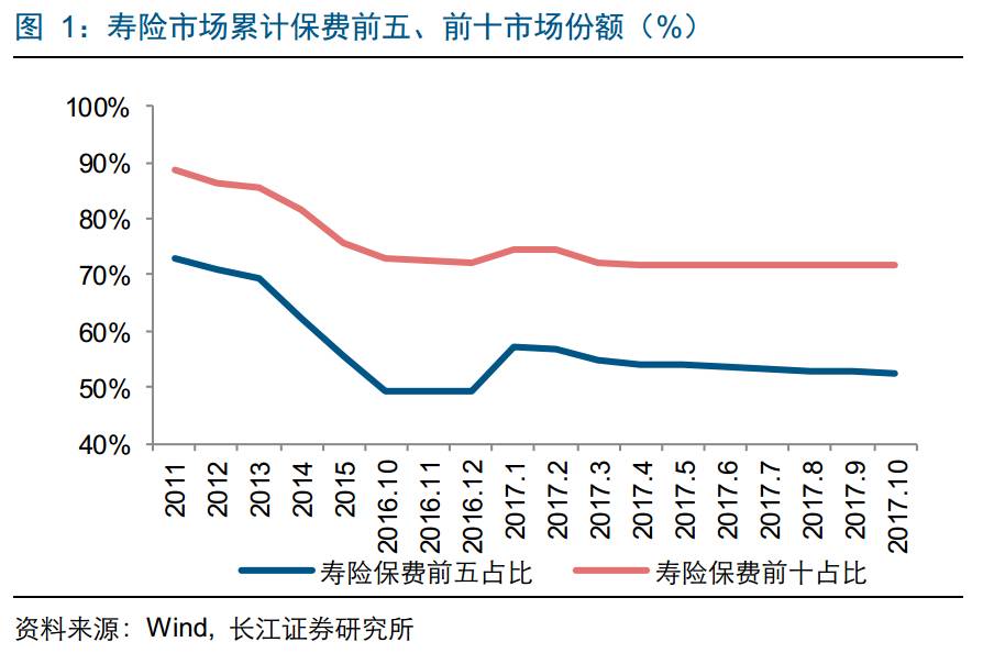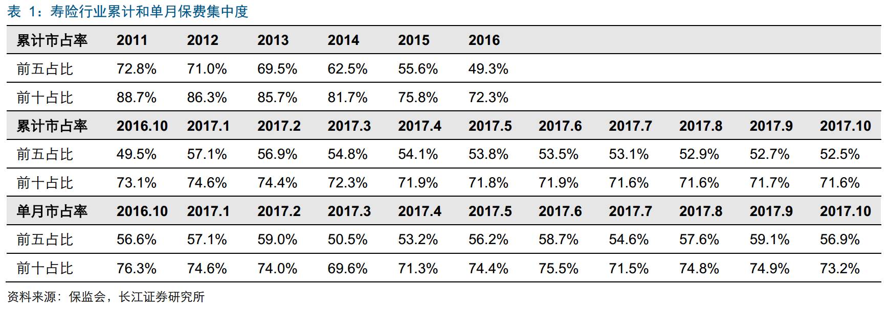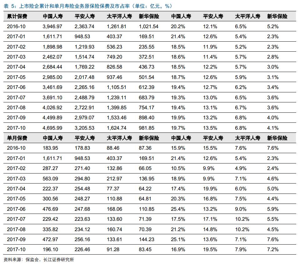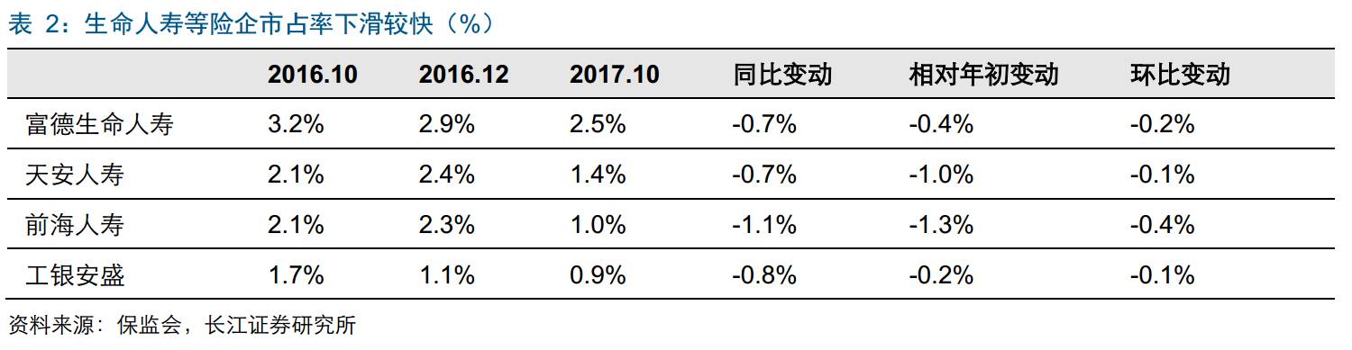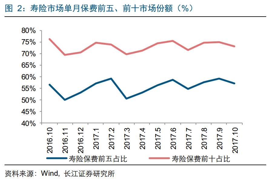 寿险前5集中度保持稳定。前10个月寿险保费收入前五和前十的市占率分别为52.5%、71.6%,环比下降0.14、0.05个百分点,集中度变化主要与安邦市场份额调整有关。