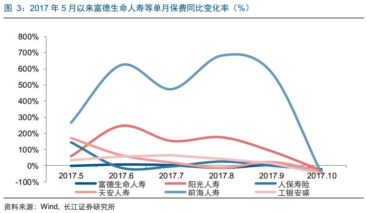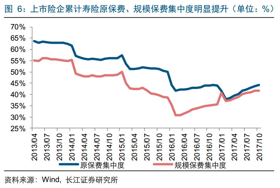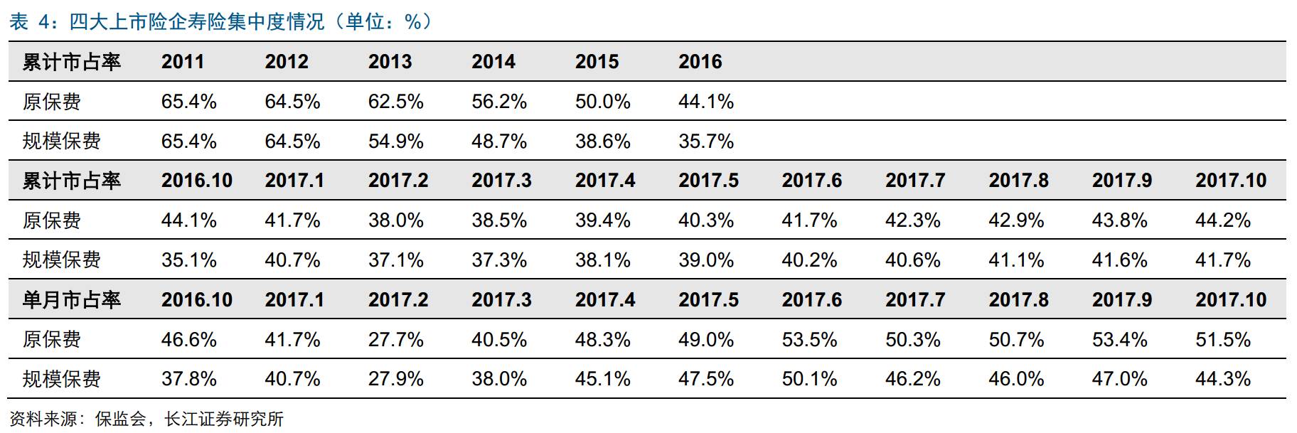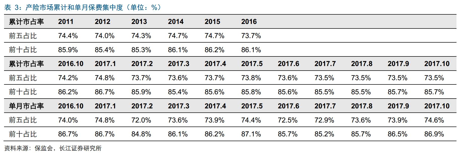 寿险前5集中度保持稳定。前10个月寿险保费收入前五和前十的市占率分别为52.5%、71.6%,环比下降0.14、0.05个百分点,集中度变化主要与安邦市场份额调整有关。