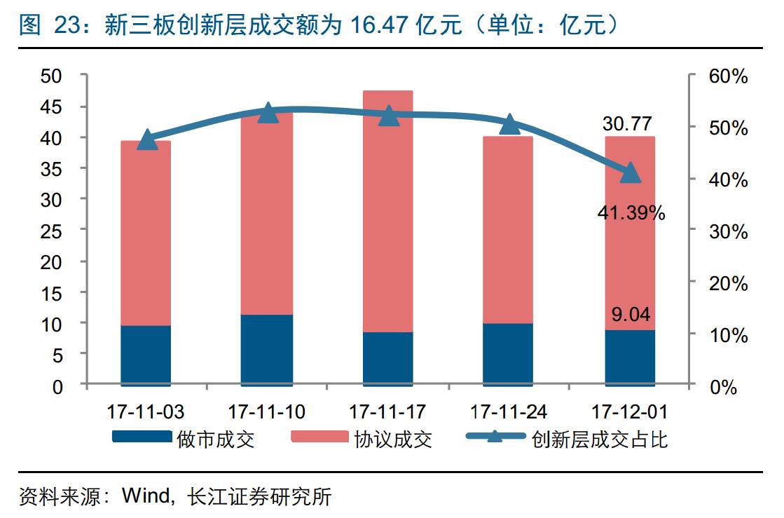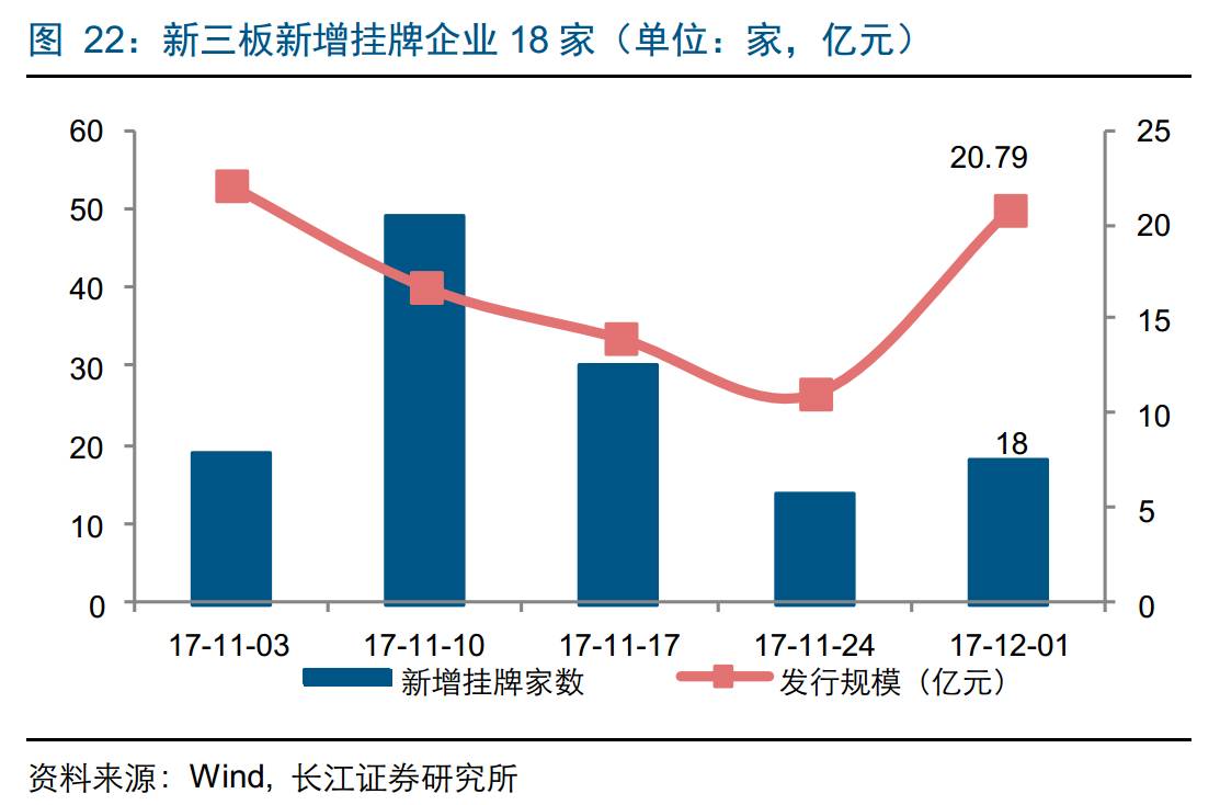 新三板业务:截至12月1日一周内,新增新三板挂牌家数18家,累计挂牌家数11632家;成交金额39.81亿元,其中做市交易9.04亿元,占比22.71%,创新层成交额为16.47亿元,占比41.39%;增发融资家数48家,规模20.79亿。