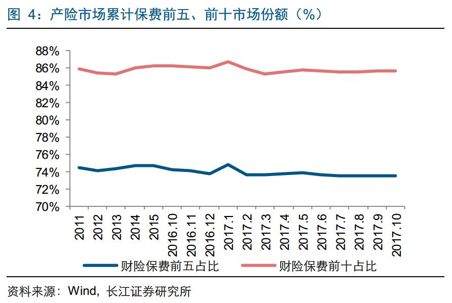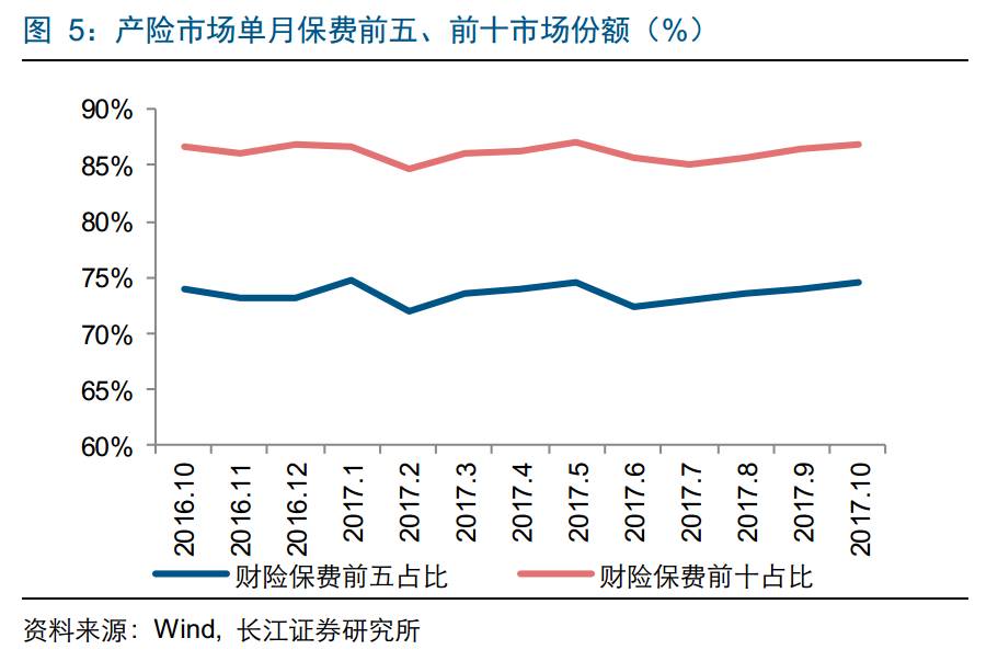 产险市场集中度持续提升。产险行业集中度持续保持在较高水平,前10个月产险保费集中度略有提升,前五、前十市场份额分别为73.5%、85.7%,环比增加0.04、0.06个百分点。