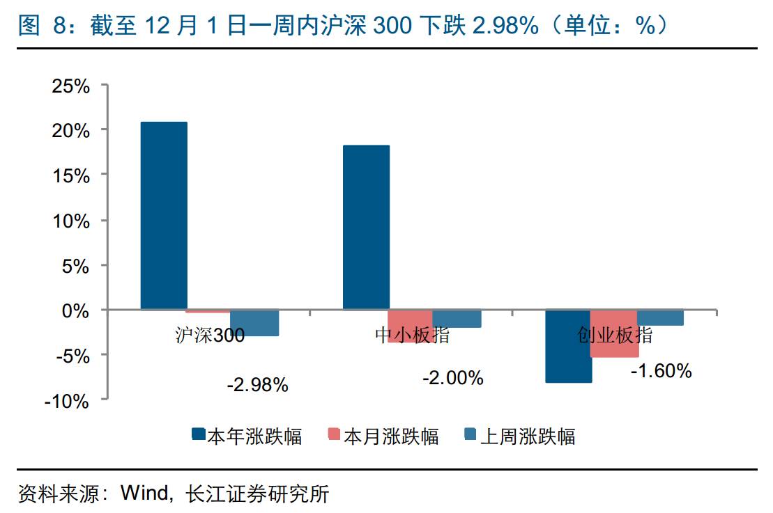 截至12月1日一周内,沪深300指数下跌2.98%,中小板指下跌2.00%,创业板指下跌1.60%,中债总全价指数上涨0.18%;板块表现方面,证券板块下跌0.67%,保险板块下跌10.62%,信托板块下跌7.82%,多元金融板块下跌3.57%。