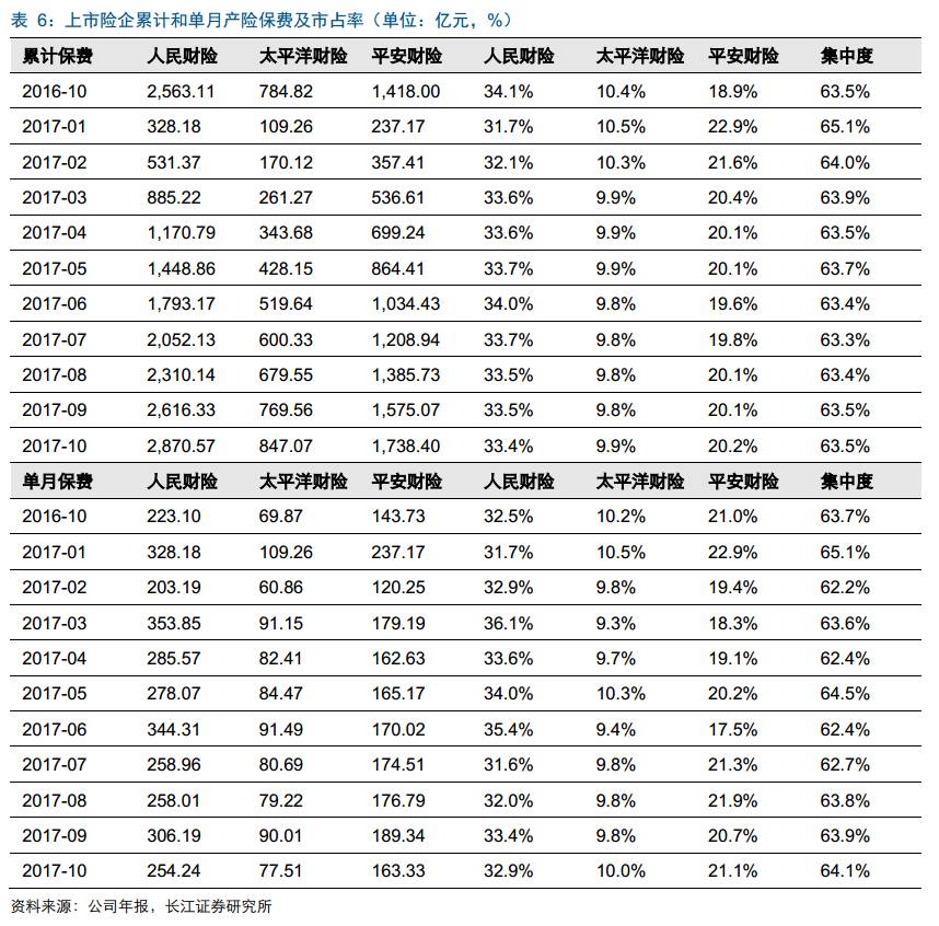上市三大产险公司市占稳定在63%左右。人保财、平安财、太保财三大产险公司保费集中度较为稳定,前10个月保费市占63.5%,环比增加0.05个百分点,从单月来看,三大险企市占率由9月的63.9%提高至64.1%,其中平安财、太保财市占率分别提升0.46、0.20个百分点。