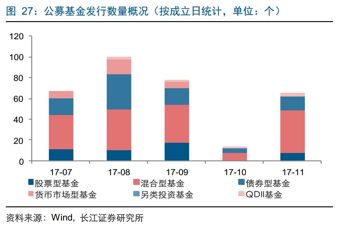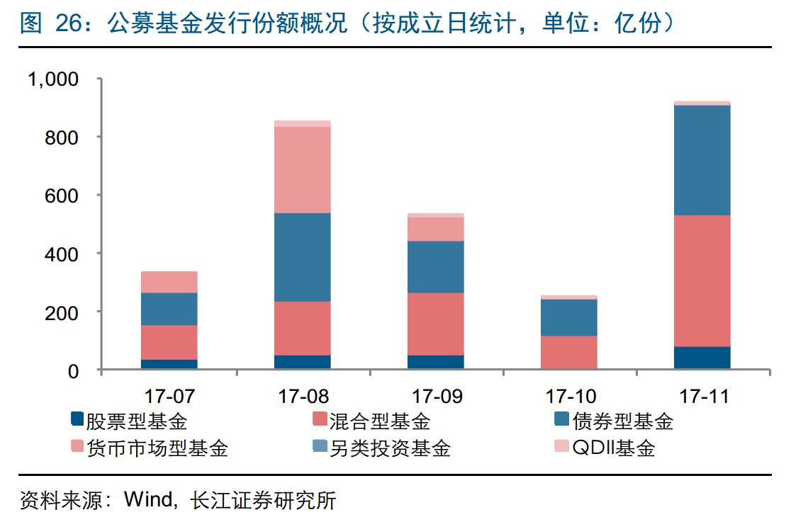 基金产品发行:2017年11月新发行基金份额916.07亿份,环比上升261.73%;其中新发行股票型基金83.58亿份,达到年内的月度份额新高。