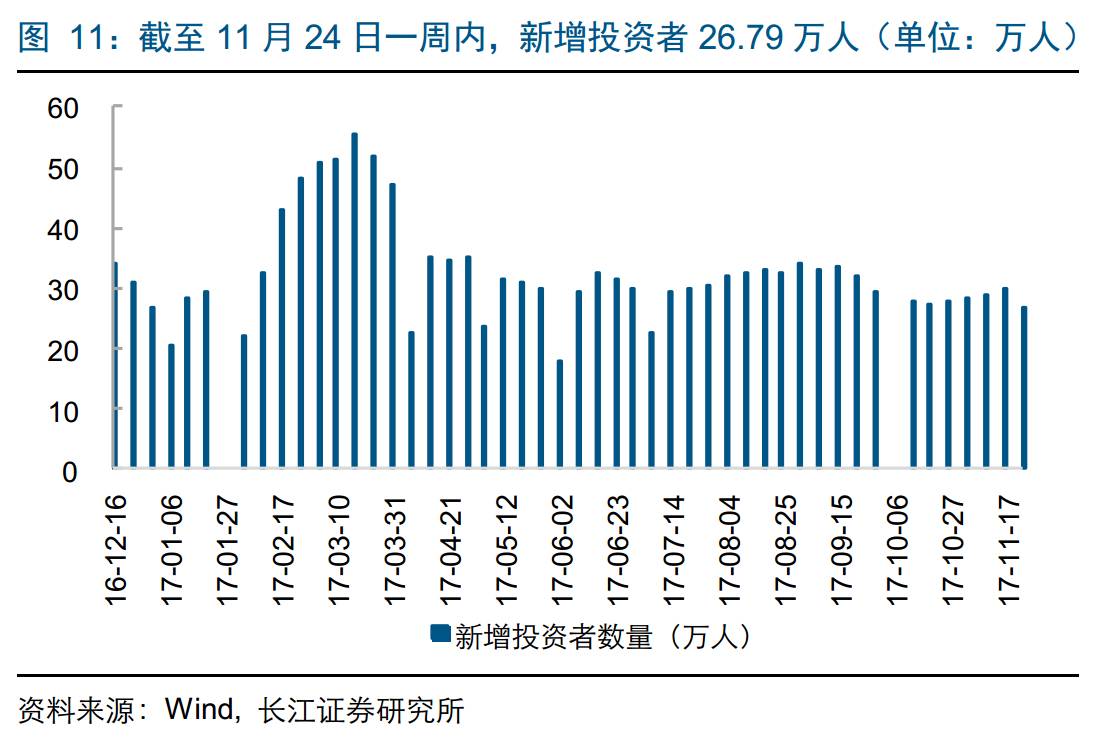 新增投资者:2017年11月17日至2017年11月24日,新增投资者数量26.79万人,环比下降9.98%。