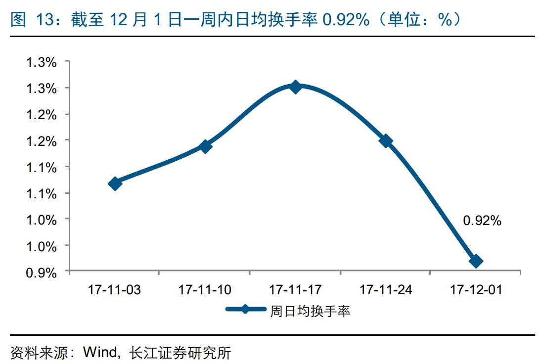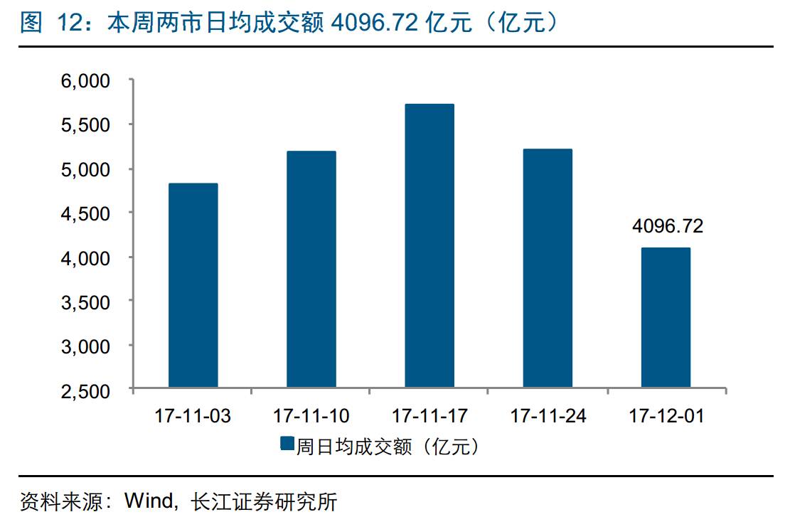 市场成交:截至12月1日一周内,两市日均成交额4096.72亿元,环比下降21.53%,日均换手率0.92%,环比下降22.95个BP。