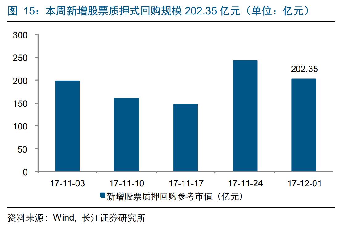 股票质押:截至12月1日一周内,股票质押新增规模202.35亿元,环比下降17.11%。