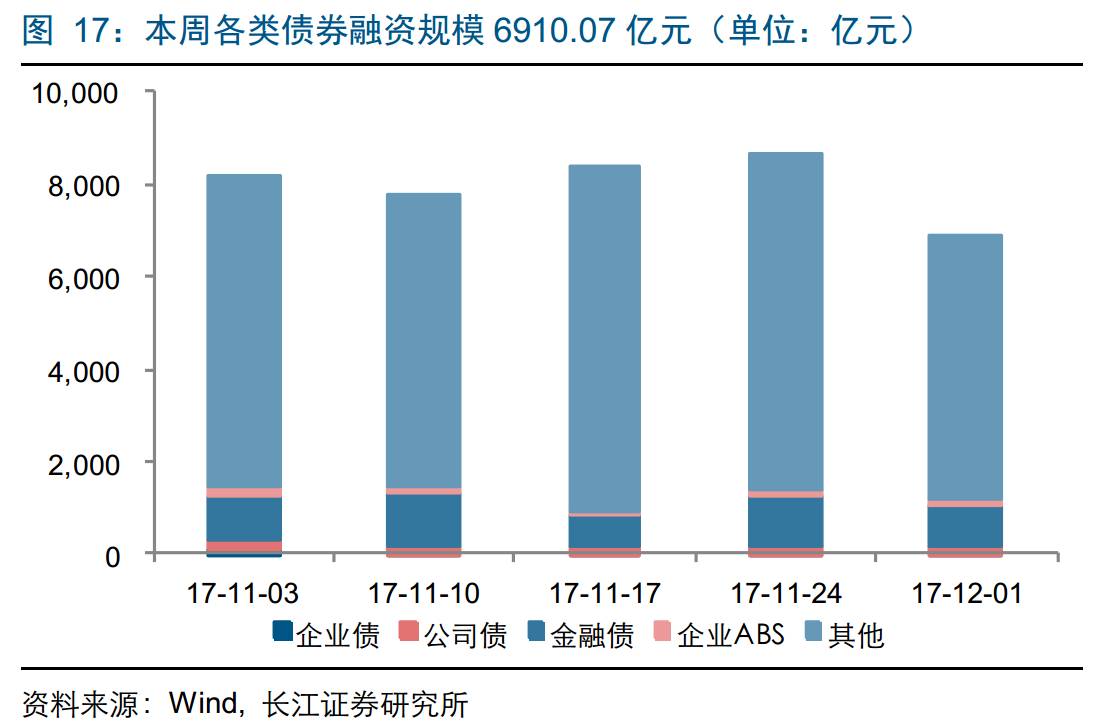投资业务:截至12月1日一周内,中债总全价指数上涨0.18%,其中3年期国债到期收益率3.7658%,环比下降0.28个BP;3年期国开债到期收益率4.6919%,环比上升0.47个BP;3年期企业债(AA+)到期收益率5.4714%,环比下降0.76个BP;6个月中短期票据(AAA)到期收益率4.9036%,环比上升9.63个BP。