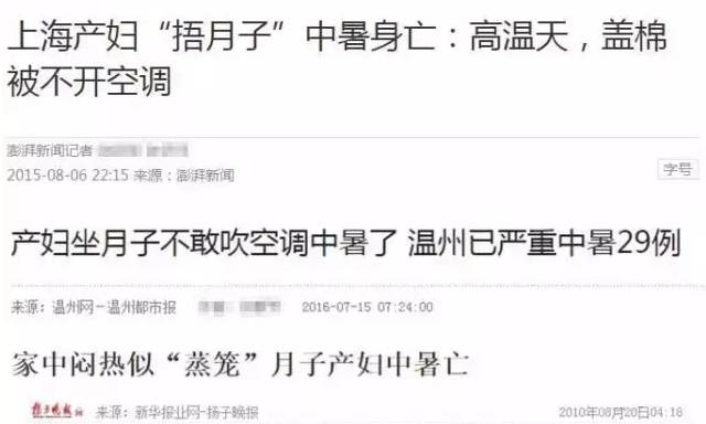 近日,山东一产妇在坐月子期间因中暑,最后不治身亡。值班医生介绍,产妇来时穿的长裤长袖。“她家人说,因为是坐月子,怕落下什么“月子病”,就穿的厚一些。”家人曾解释,家里坚持不让开风扇和空调,还让产妇盖着厚厚被子。