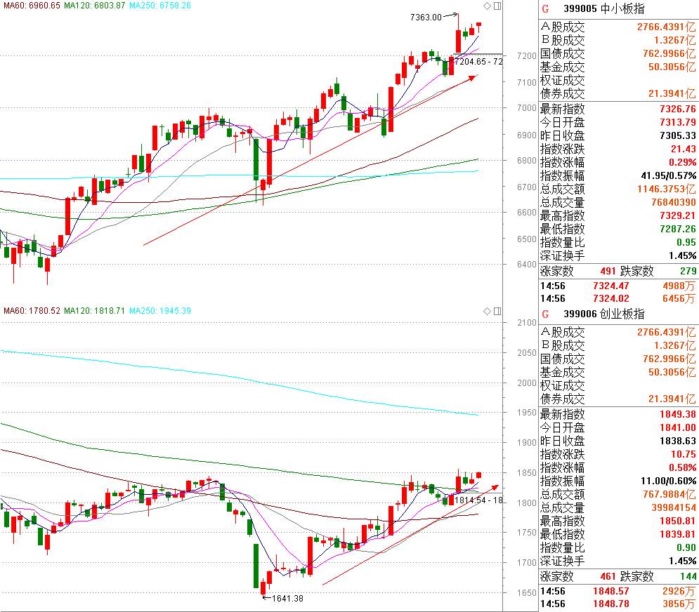 周四两市小幅低开,随后涨跌互现。继昨日尾盘银行股砸盘后,沪指领头下挫,盘中一度下跌0.68%,似乎是有意给大盘降温。但资金热度未减,午后开始缓慢回升,全天完成小V反弹,5日线失而复得,收出十字星形态。深成指走势与沪指相似,只是幅度较沪指稍小。创业板则较为强势,全天位于平盘线上方运行。