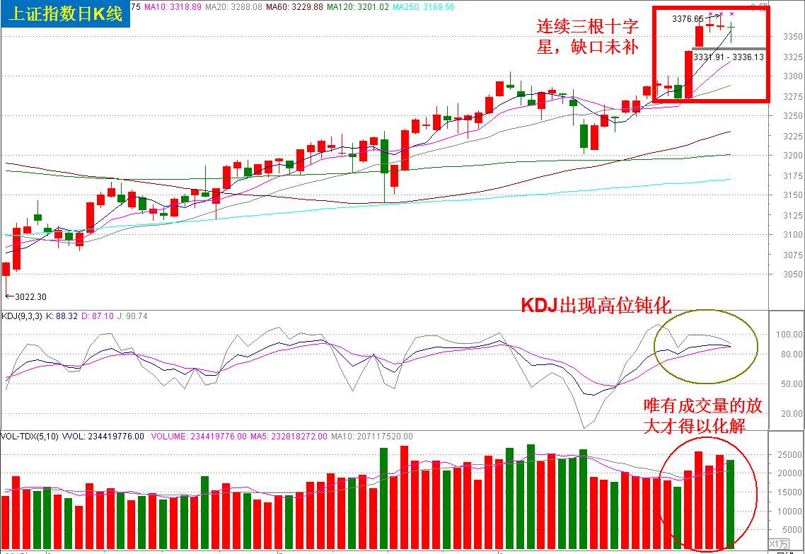 大盘目前已连续3天收十字星,前2个是上攻受阻长上影线,今日十字星是下跌拉起长下影线,说明上方压力仍不能小觑。继上周五和本周一上攻后,近期量能稍显不足。另外周一缺口3331附近今日还未回补,KDJ也出现高位钝化,短期只有量能的放大才能得以化解这一尴尬。