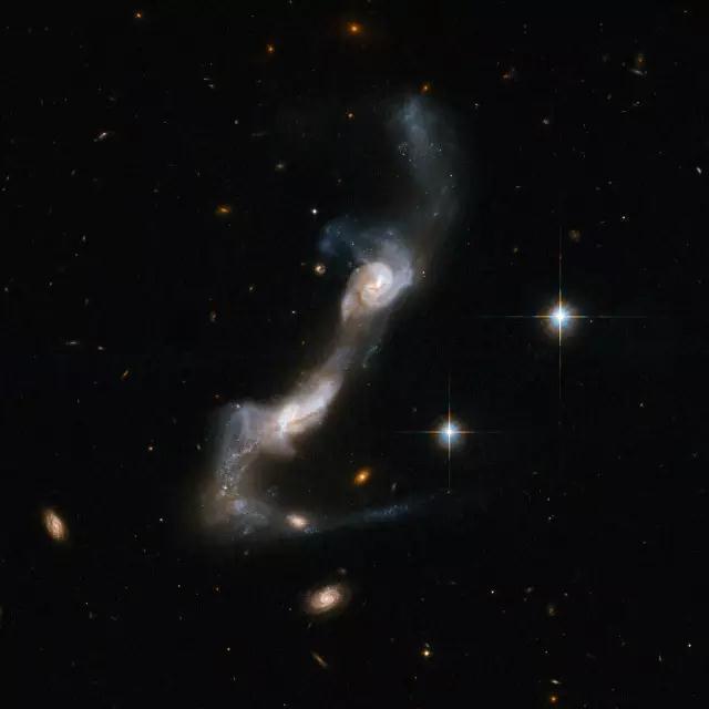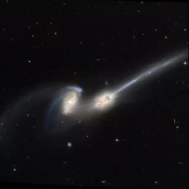 处在右边的是NGC 6621星系,左边的则是NGC 6622星系,它们位于距地球约3亿光年的天龙星座(Draco),合并时间约有1亿年。两座星系在引力的巨大作用下相互攻城略池,形成了一道恒星长尾,同时触发了一连串的恒星诞生。