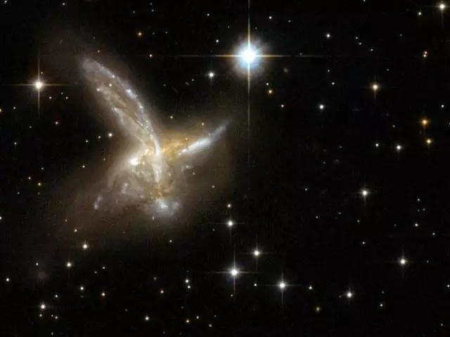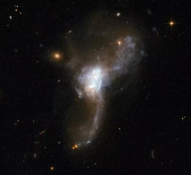 这座奇异的天体被称为ESO 148-2,正面看上去有些像半翅类水虫。它位于距我们约6亿光年的位置,而它奇怪的形状正是由于星系合并造成的,,大量的物质被卷入两只弯曲的“翅膀”中。
