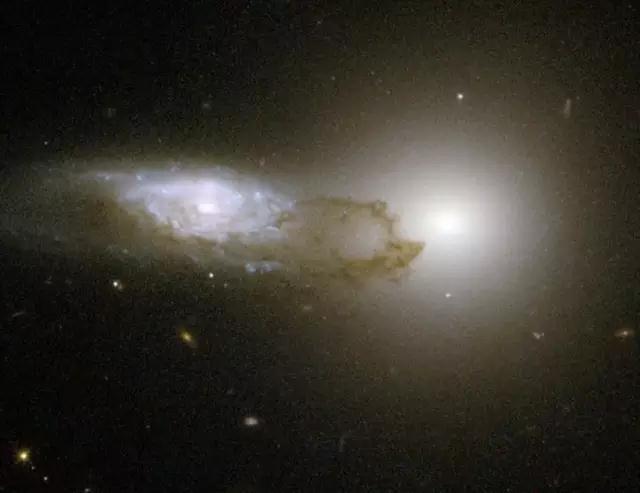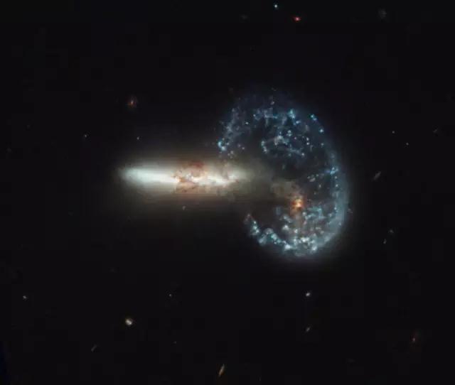 图中星系碰撞的一方正将另一方吞噬,它被科学家称作马约尔天体,位于距我们约4亿光年的大熊星座(Ursa Major)。当两个母星系首次发生碰撞时,就形成了这奇特的环尾形状,,产生的冲击波向外围扩散,形成了巨大的“戒指环”。