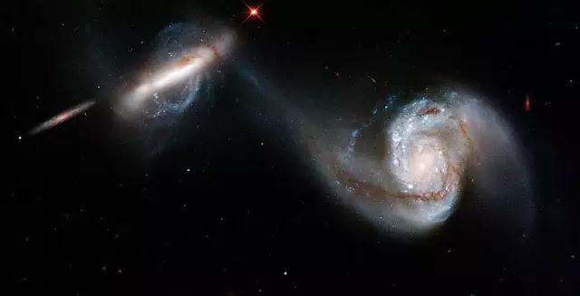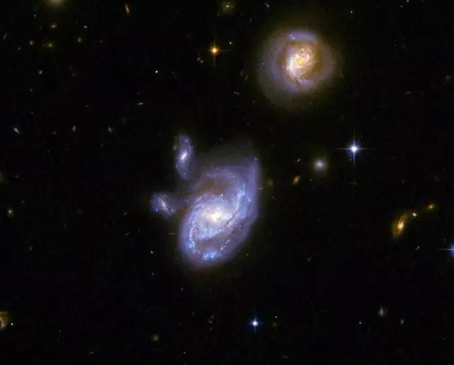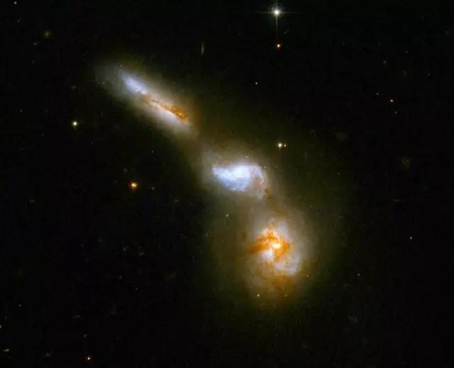 这也许是最可爱的星系合并了——廷克贝尔三胞胎是三个星系碰撞重组成的天体,位于距地球约6.5亿光年的位置,我们在图中看到的是可见光和红外线波段的叠加。