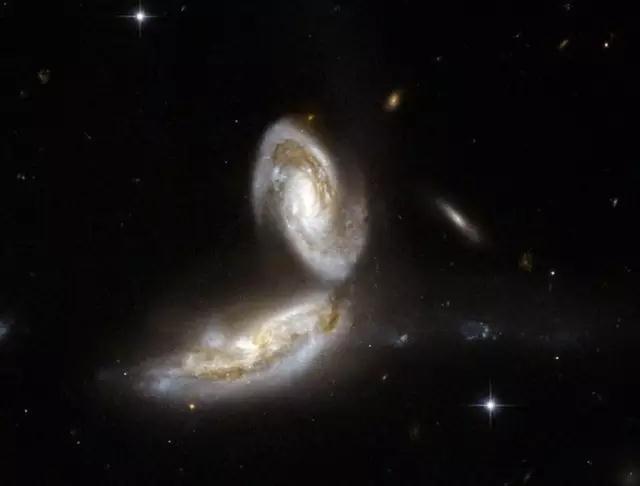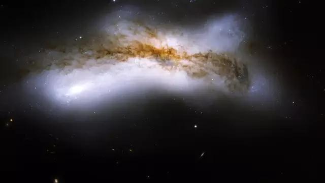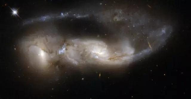 通过一段长长的恒星桥连接,UGC 8335合并星系中的两个原星系在引力的作用下相互尽力推搡。这场碰撞发生在距地球约4亿光年以外的大熊星座(Ursa Major)。