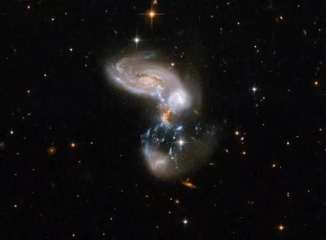 图中是处在星系碰撞合并中期阶段的NGC 520,位于距我们约1亿光年的双鱼座(Pisces)。两个母星系的“躯干”部分差不多已经融为一体了,。科学家推测,这场碰撞大约在3亿年前就开始了。该星系是夜空中最明亮的星系组之一。