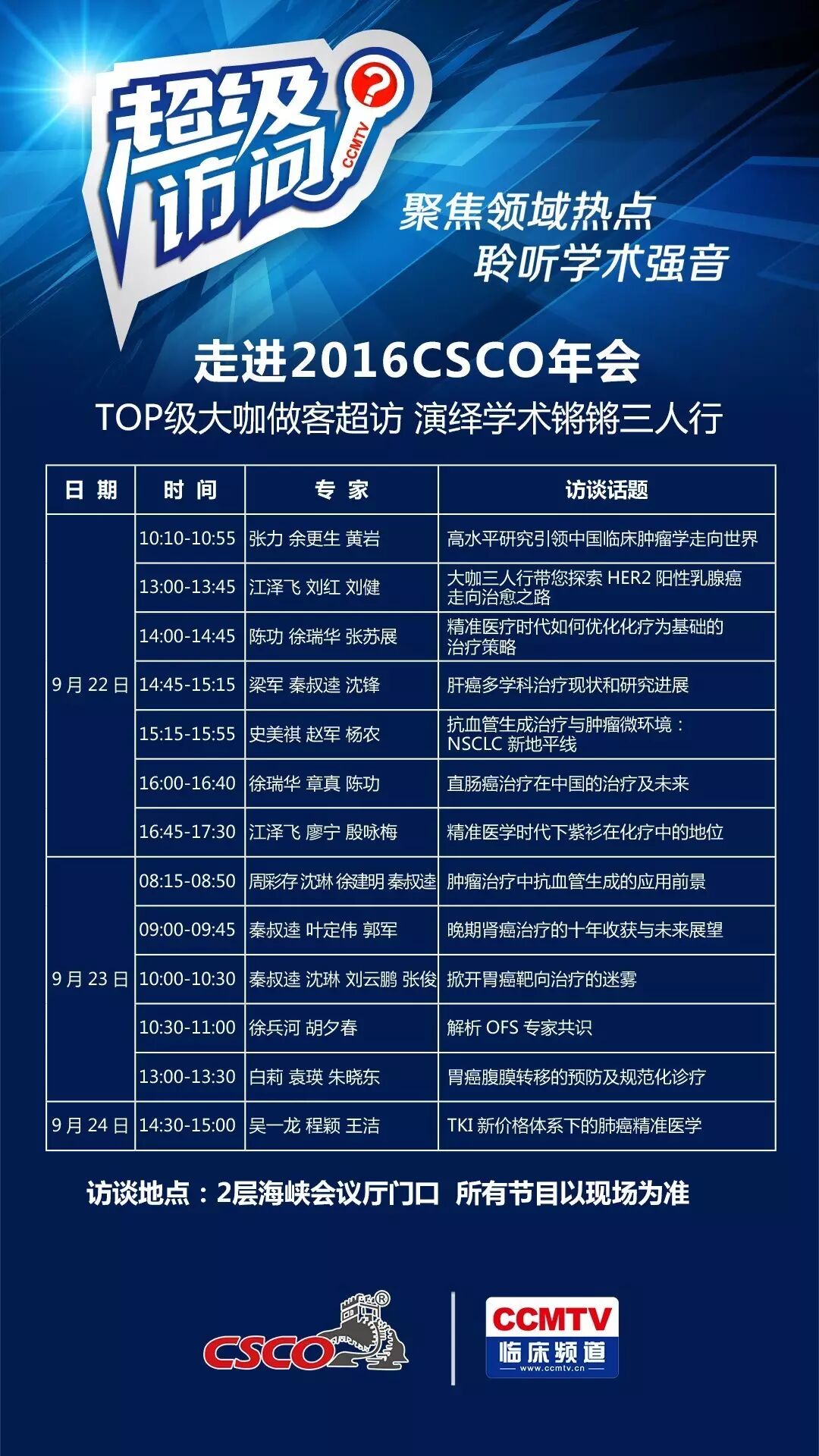 2016年9月21~25日,第十九届全国临床肿瘤学大会暨2016年CSCO学术年会再次相约海滨之城厦门国际会议中心。9月22日,CSCO官方合作媒体CCMTV-临床频道的王牌节目之一《超级访问》,于2016年CSCO学术年会召开期间,邀请了国内肿瘤领域的众多大咖就乳腺癌、鼻咽癌、肝癌、结直肠癌、肾癌等诸多肿瘤的研究成果、诊疗进展以及治疗策略等问题展开热烈讨论。