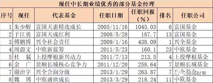 而在现任基金经理中,也不乏长跑健将,除了富国基金朱少醒,还包括富国基金于江勇、、中欧基金周蔚文和魏博、景顺长城基金余广、上投摩根基金杜猛等。近年来也涌现出不少的投资新星,他们的未来表现值得期待。