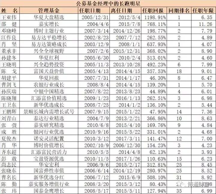 牛基的背后其实是一个又一个战胜牛熊、投资能力突出的优秀基金经理。公募基金行业中曾经或者现任的基金经理中,涌现出的长跑明星还有很多。在他们管理基金期间,多取得了远超市场和同类基金的业绩。