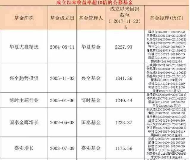 在成立以来收益超10倍的12只基金中,基金兴华是唯一一只传统封闭式基金,该基金1998年4月28日成立,是当年成立的首批5只传统封基之一,2013年4月11日到期“封转开”。在运作的接近12年的时间里,基金兴华单位净值增长率达到11.22倍,成为史上最牛封基。王亚伟是该基金首任基金经理,此后还先后有8位基金经理掌管过该基金,他们的接力成就了封基之王。