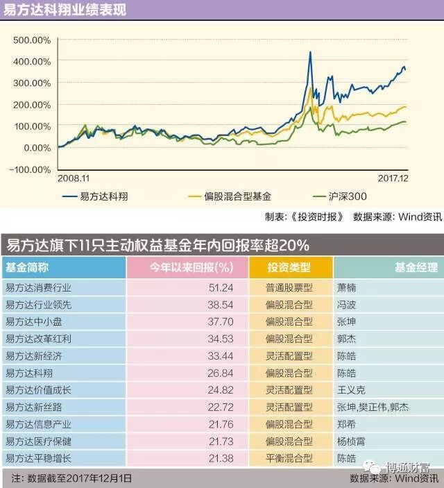 数据显示,易方达科翔自2001年5月成立以来的16年中,复权累计净值增长率达到1929%,年化收益率高达20%。