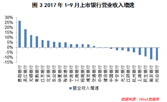 分银行看,25家上市银行中,营收增速最快的是贵阳银行,2017年1-9月同比增长27.07%(参见图3)。值得注意的是,2016年和2017年上半年,贵阳银行营收增速一直遥遥领先。同期,兴业银行的营收增速降幅较大,2017年上半年营收同比下降13.16%。