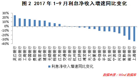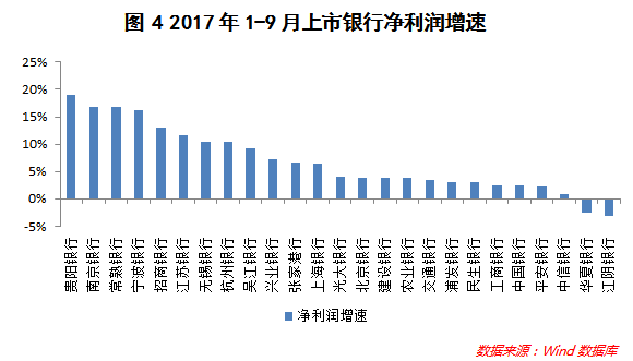 净利润增速方面,25家上市银行中,净利润增速最快的是贵阳银行,2017年1-9月同比增长18.93%。同期,仅华夏银行和江阴银行的净利润增速为负,净利润分别同比下降2.46%和3.19%。