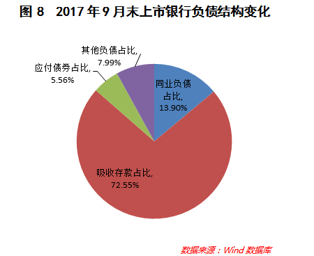 2017年9月末,上市银行总负债同比增长8.47%,增速季度环比下降1.32个百分点,负债增速基本上保持与资产增速同步增长。