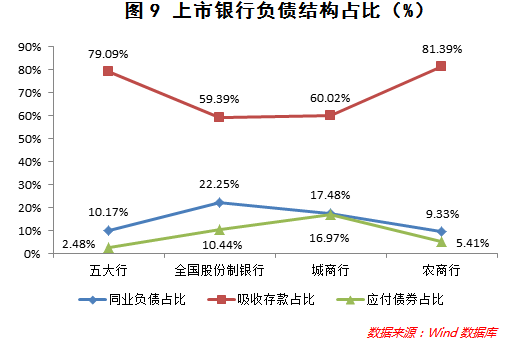 比较五大行、股份制、城商行和农商行,负债结构差异比较大。具体来说,五大行和农商行的存款占比高,2017年9月末占比均超过78%,其中,五大行营业网点具有明显优势,而农商行扎根县域,服务三农,客户群体中存款倾向较高。同期,股份制银行和城商行的存款占比相对较低,分别仅占总负债的59.39%、60.02%,其对主动负债的依赖度更高。