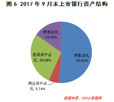 从资产结构看,上市银行贷款规模占比进一步提高——从2017年6月末的50.29%提升至9月末的50.91%;投资资产和同业资产占比有所下降——2017年9月末,投资资产和同业资产占总资产的比重分别较2017年6月末下降0.08个百分点和0.41个百分点(参见图6)。