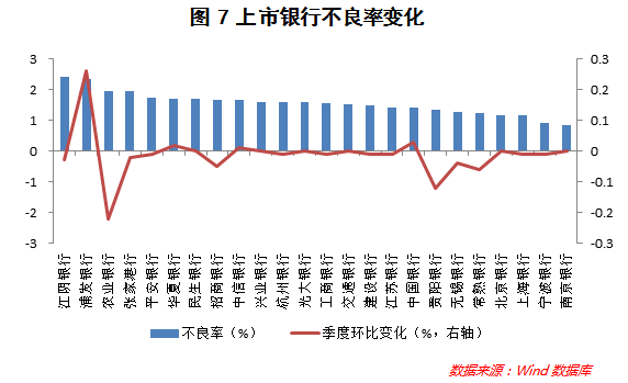 从资产质量看,2017年9月末,上市银行整体不良率均值为1.56%,较2017年6月末进一步下降0.02个百分点,资产质量持续好转。同期,14家上市银行的不良率季度环比下降,但浦发银行不良率增幅较大,季度环比提高0.26个百分点(参见图7)。