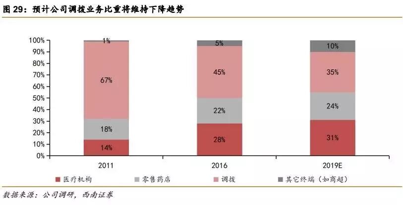 调拨业务:产业链下移,实现渠道聚拢,占比逐渐下降。“两票制”背景下,公司调拨业务未来有望转向零售、医疗机构的纯销,毛利率有望提升。调拨业务占收入的比例已由2011年的67%下降到2016年的45%,预计未来3年比例仍将下降,2019年将下降至30%左右。