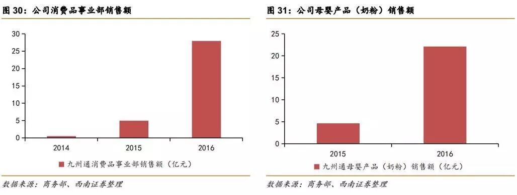 该事业部成长迅速,我们估计2016年占公司批发收入的比例约5%。其中母婴产品(奶粉)业务上量最为迅速,,公司的物流体系为药品流通体系,并覆盖全国,在承接母婴业务上具备优势。公司强化与战略品牌的深度合作,在全国范围内布局雅培、惠氏等产品终端,2016年惠氏实现含税销售12.89亿元、雅培实现含税销售7.08亿元,分别较2015年同期增长 2962.7%和170.93%。