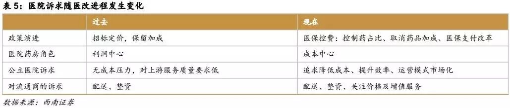 二级以上医疗机构市场为医药流通的主战场,占药品终端的比重约70%。过去的采购体系中,医院药品定价已在招标环节确定,医院通过药品加成赚取利润,无成本压力,对上游服务质量要求较低,流通公司仅承担配送与垫资功能,向医院提供的服务质量与效率未体现出明显的差异化。但近期随着医改的推进,医疗机构面临“控费压力”,尤其是“按病种支付”等医保支付方式改革将药品变成医院的成本中心,药品定价不再是通过招标一锤定音,医药流通公司的质量与效率逐渐成为核心竞争力,行业进一步“市场化”。