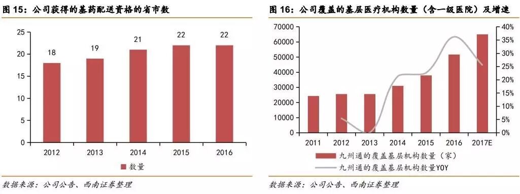 基层终端为公司的优势区域。公司近年来积极参与各省市基药配送资格招标,截至2016年末,在已公布基本药物配送资格的31个省(市、区)中,除宁夏、河北、海南、贵州、云南、青海、湖南、西藏和陕西由于尚未设立子公司或子公司营业时间不久未能赶上招标窗口期外,公司共获得了22个省市的配送资格、累计取得1089个区县配送权。我们预计随着2017年各省份新标的陆续切换,公司将取得更多省市的基药配送资格。
