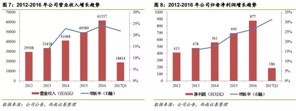 2012-2016年期间,公司收入和归母净利润复合增速分别为20%和21%,保持了高速增长趋势。2017Q1的收入和归母净利润大幅度增长,增速分别达到22%和31%,主要原因是公司西药、中成药核心业务以及医院纯销、医疗器械以及消费品等战略业务快速增长所致。