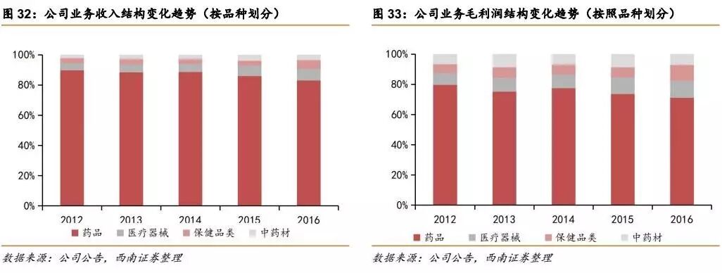 从经营具体品类来看,可分为药品、医疗器械、保健品及中药材。其中药品为公司收入主要来源,在2016年收入约为510亿元,占比约83%,其次为医疗器械、保健品类及中药材;2012~2016药品、医疗器械、保健品及中药材的复合增速分别为18%、38%、36%和34%,非药品领域业务增势喜人。