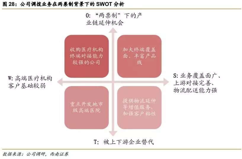 我们对公司的调拨业务进行了SWOT分析,在“两票制”背景下,公司调拨业务的机遇和挑战共存。“两票制”推行后,调拨业态迎来转型机遇,公司为全国第四大流通企业,规模优势突出,在行业整合中扮演“整合者”的角色,可在调拨的基础上进行产业链上下游延伸,以完善之前较弱的二级及以上医疗机构终端布局,即调拨业务向纯销转型。