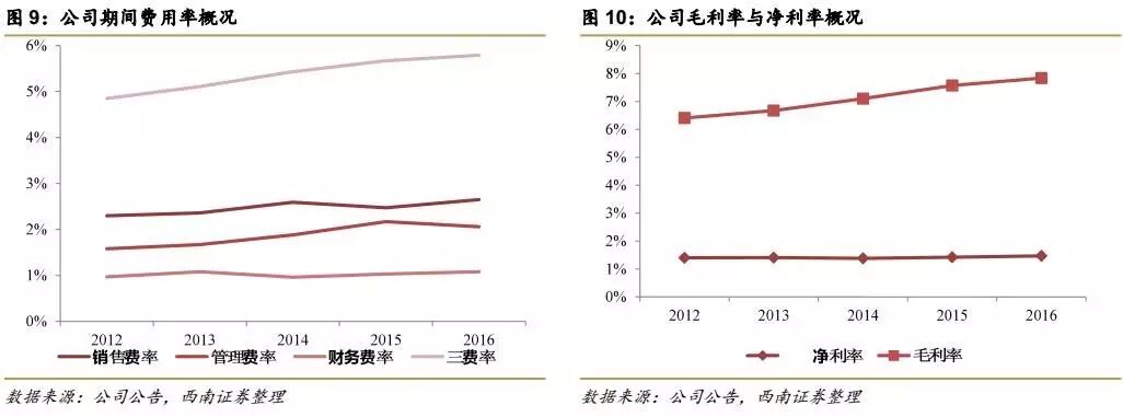 我们认为药品毛利率上升主要是公司加大与优质供应商的合作力度,以及创新营销模式,提升营销能力,大力拓展终端业务所致。根据我们的判断,随着客户不断优化及策略调整,药品领域的毛利率仍有上升空间。保健品业务也是2012-2016年毛利率及利润均出现上升的领域,但是由于其全面拓展母婴、食品、化妆品、日用品等业务毛利率相对较低,故对于该领域的判断是收入增速将快于毛利增速。中药材及医疗器械的毛利率有所下滑,均与产品结构调整有关,但都在布局下游业务,预计毛利率有逐渐回升趋势。