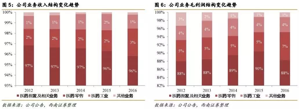 从业务结构来看,医药批发及相关业务贡献了96%以上的收入和接近90%的毛利。近年来随着医药零售业务收入快速增长,比重扩大,2016年的收入和毛利占比分别达到了3%和7%。医药工业占比基本保持稳定。