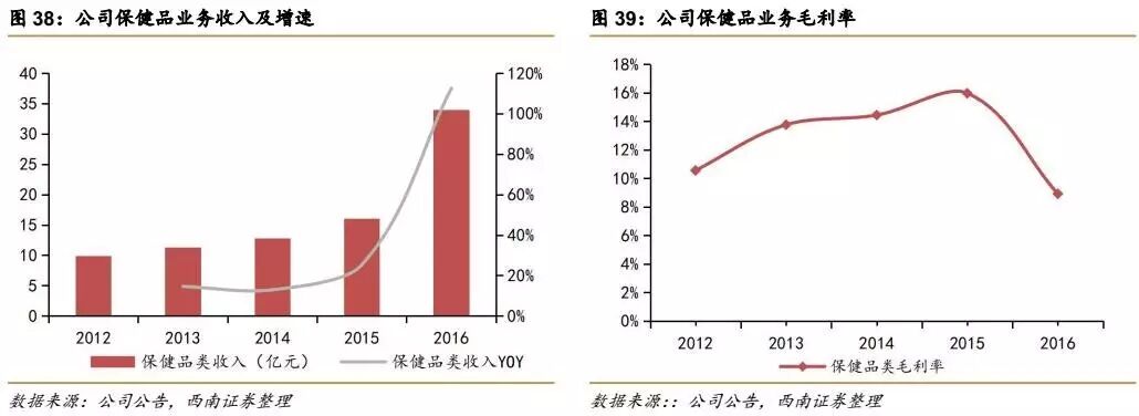 保健品业务:随着母婴产品的放量,保健品业务处于高速成长期。2016年毛利率下降较多的主要原因是毛利率较低的母婴业务占比大幅提升所致。