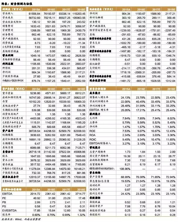零售药店终端:两票制及税改推动公司配送份额提升。零售市场为公司优势业务区域,随着处方外流、下游的规范与集中度提升,我们认为公司将是零售终端流通整合的最大受益者,2017年为两票制政策落地的关键之年,预计公司在零售终端的增速将显著提升,未来3年增速维持在30%以上。