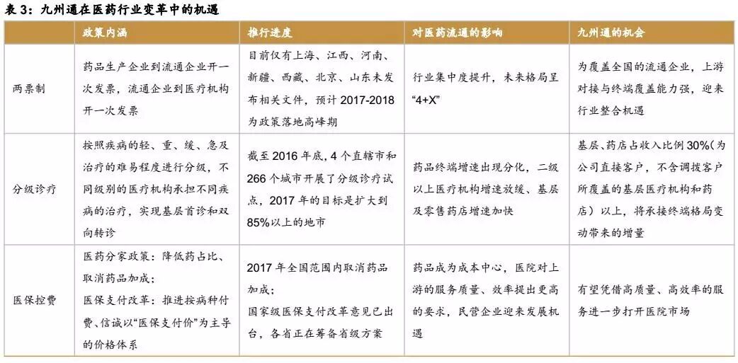 随着医改的推进,2017年为医药流通行业剧变之年。我们认为医改政策中对流通行业产生直接影响的主要为两票制政策、分级诊疗政策及医保控费相关政策。医药流通行业将呈现行业集中度提升、细分市场增速分化、市场化程度提高三个变化,九州通通过前期的业务布局,各细分市场的业务均本轮行业变革中迎来发展机遇。