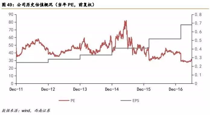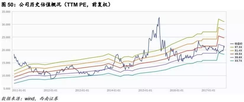 当前股价对应公司17-19年PE分别为31倍、21倍、17倍,TTM估值约40倍。历史估值对应当年EPS约40倍,TTM估值约50倍,当前估值处于历史估值低位。