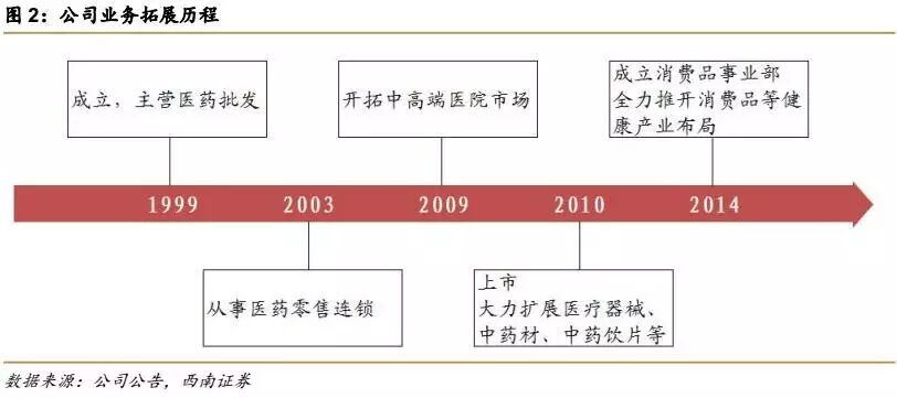 公司成立于1999年。从主营业务业态来看:成立之初主营业务为医药批发,主要专注基层、零售药店及调拨市场。2003年起从事医药零售连锁业务,2009年开始开拓中高端医院(二级及以上医疗机构)市场,2010年上市、大力拓展医疗器械、中药材及中药饮片业务,2014年成立消费品事业部、全力推开消费品等健康产品布局。经过良好的前期布局,且在“两票制”、“分级诊疗”等政策的推动下,目前各业务均处于高速成长阶段。